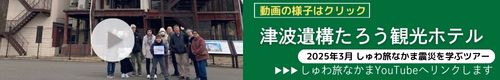 | 1 | 盛岡駅(10:00)集合 午前 バスに乗車==道の駅たろう(田老)へ 道の駅たろう・防災ガイドと共に、津波遺構(たろう観光ホテル)を見学(約60分) 見学後、浄土ヶ浜にて自由散策(浄土ヶ浜レストハウスにて各自昼食) 昼食後、宮古駅へ 午後 三陸鉄道・宮古駅~鵜住居駅間を『震災学習列車』に乗車(約80分) 鵜住居駅にて下車後、いのちをつなぐ未来館にて見学(約30分)